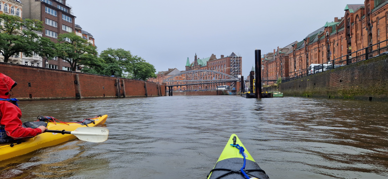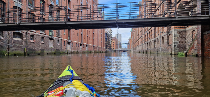 Hinter der Schleuse öffnet sich das Paradies für uns. Hier waren wir vorher noch nie mit dem Boot. Allerdings öffnen sich auch die Himmelsschleusen und wir werden Zeugen der typisch hohen Luftfeuchtigkeit in Hamburg. Kennen wir schon, aber jetzt wird es langsam auch kalt und ungemütlich. Um die Stimmung aufzuhellen, wärmen wir uns in einem (Eis!)-Café auf und trinken einen Cappuccino. Wir waren zu schnell und müssen noch zwei Stunden bis Hochwasser rumkriegen. Also paddeln wir durch die Speicherstadt und machen Fotos bei Sonnenschein.