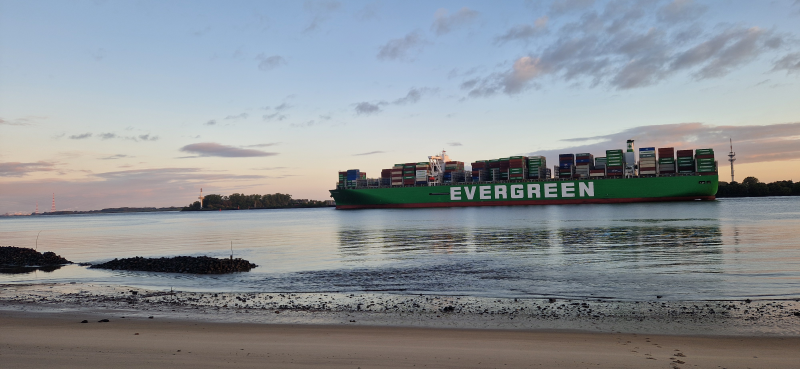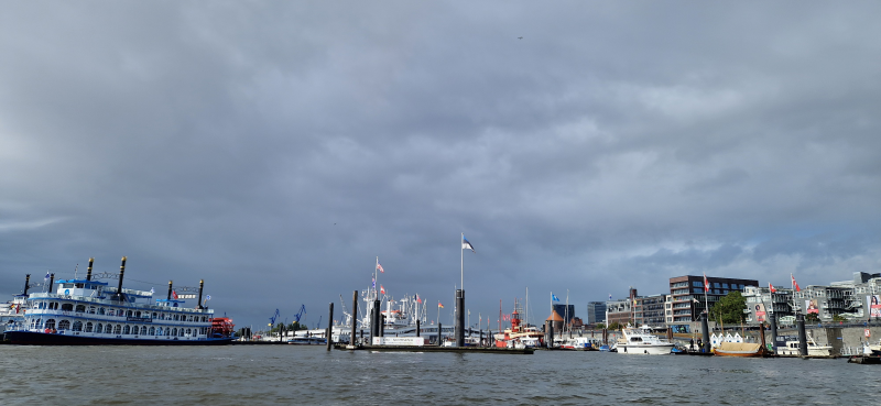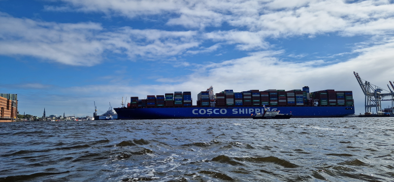 Pünktlich zum die Elbe ablaufenden Hochwasser starten wir auf die Unterelbe. Ehrlich gesagt spüren wir nicht viel vom Tidenstrom. Wir hatten bis zu 4 km/h erwartet, aber der heftige Gegenwind bremst uns enorm. Wir werden daher sicherlich nicht so weit kommen, wie wir ursprünglich geplant hatten. Aber wir haben alternative Übernachtungsmöglichkeiten vor unserem Ziel im Visier. Wir paddeln also durch den Sportboothafen, drücken uns hinter den Landungsbrücken zwischen Ausflugsdampfern und Kaimauer vorbei in den der Containerschifffahrt beherrschten Teil des Hamburger Hafens. Hier wird das Wasser rauer und die meterhohen Wellen verlangen volle Konzentration. Keiner will hier falsch von einer Welle erwischt werden und kentern, denn vor uns wird ein riesiger COSCO-Frachter gedreht. Er nimmt fast die gesamte Breite der Wasserstraße ein. Die Hafenaufsicht ist mit ihrem Boot auch da und beaufsichtigt die Arbeit der Bugsierer. Von uns kleinen Kajaks scheint hier tatsächlich keiner Notiz zu nehmen.