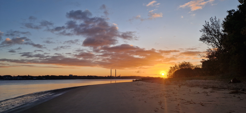 Nach einem „Pit-stop powered by Blankeneser Segel-Club“ erreichen wir gegen 17 Uhr Wedel. Wir kreuzen vorschriftsgemäß senkrecht die Elbe und haben uns anscheinend den ungünstigsten Zeitpunkt ausgesucht: Die meterhohen Wellen flauen erst ab, als wir auf der anderen Seite ankommen. Aber wir haben uns durchgekämpft, da wir den ausgewiesenen Wasserwanderrastplatz auf der Insel Hanskalbsand gegenüber von Wedel erreichen wollen. Noch weiter bis Lühesand (10 km) oder bis Pagensand (weitere 20 km) muss bei Gegenwind nicht sein. Als wir die Zelte aufbauen, haben wir 37,38 km auf der Uhr. Wir kochen schnell Nudeln und verschwinden bereits um 20:30 Uhr todmüde in unseren Schlafsäcken. In der Nacht werden wir begleitet vom Plätschern der Gezeiten und Brummen der Frachter.