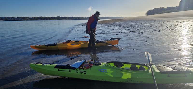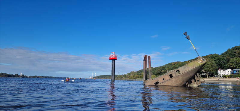 Das letzte Wochenende im September 2024 hatte schon regnerisch und grau begonnen. Warum sollte man da Lust aufs Paddeln haben? Hatten wir auch nicht, sondern nur Lust auf die Perspektive, das erste Mal im Leben auf der Elbe paddeln zu können. Die Elbe ist anders als unser Heimatrevier „Alster“, nämlich tidenhub-abhängig. Man kann nicht fahren, wie man will, sonst gerät man ungeplant in eine Gegenströmung und kommt nicht vorwärts. Man muss also Ebbe und Flut vom Zeitpunkt her mit einplanen und mit der Gezeitenströmung paddeln. Außerdem sind die Wellen unter Umständen hoch und die Berufsschifffahrt nimmt keine Rücksicht auf Kajaks. Immer wieder kommen Kajakfahrer:innen auf der Elbe ums Leben, die nicht richtig ausgerüstet sind. Trockenanzug oder Neopren sowie Schwimmweste und Spritzdecke sind also Pflicht!